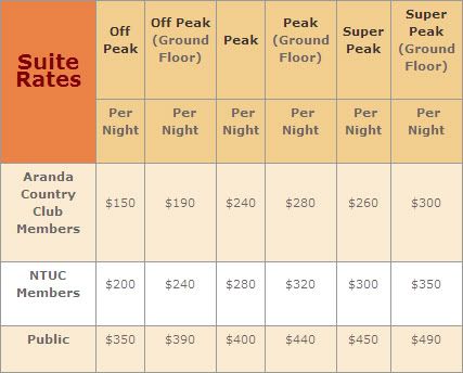 Here's rates for Aranda:Off Peak: Sun to Thur (Excluding School Holidays, Eve of Public Holidays, Public Holidays)